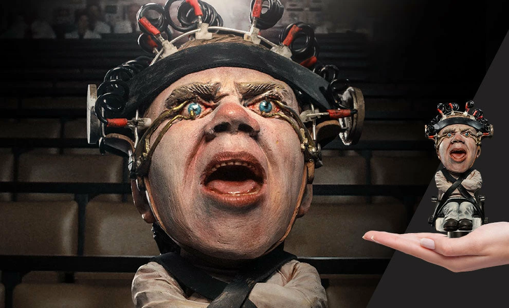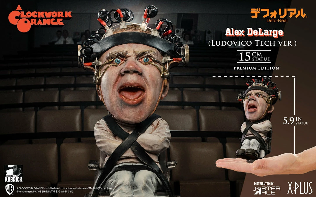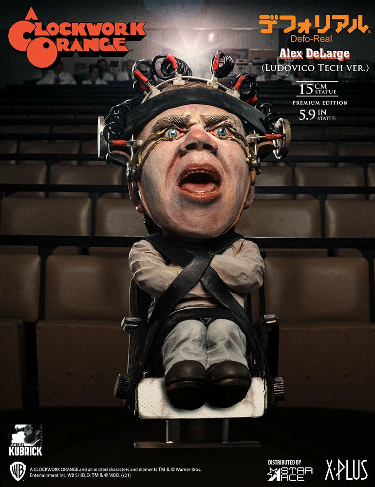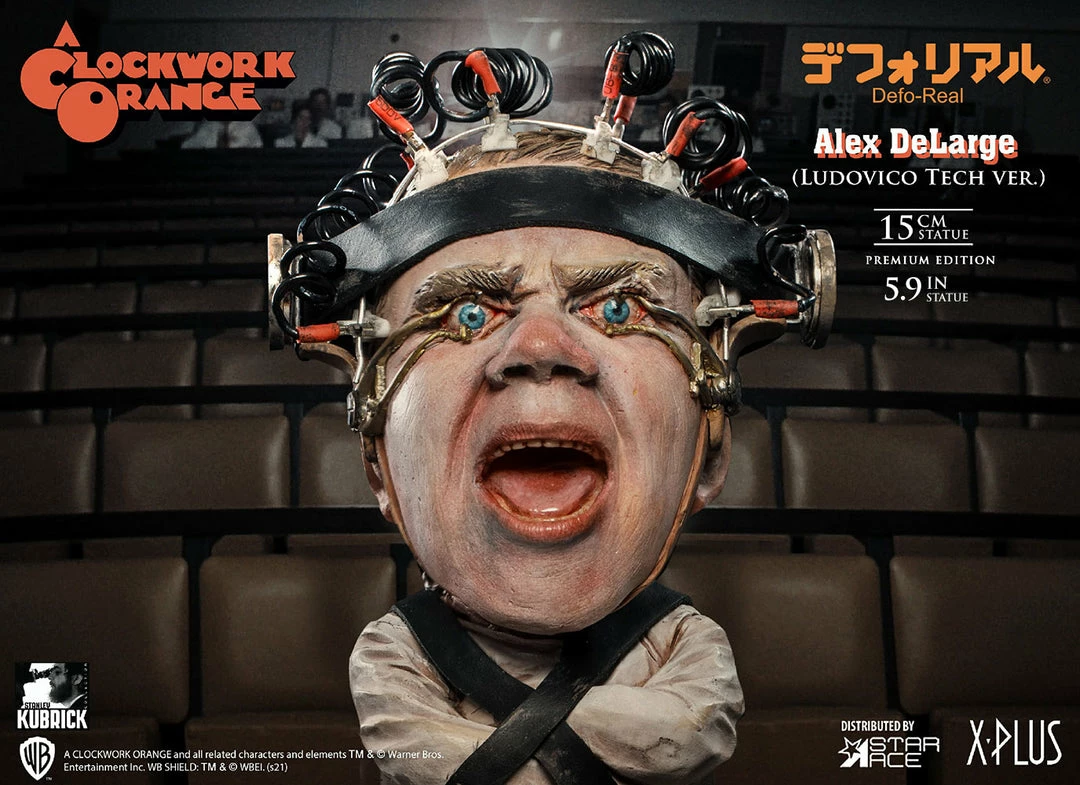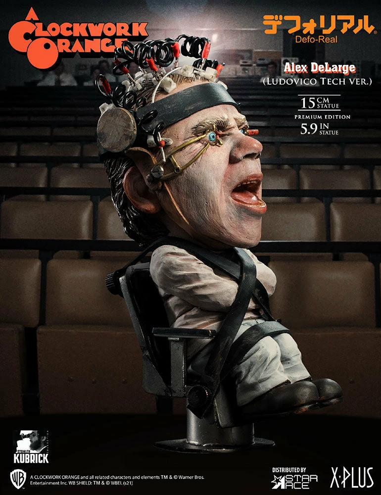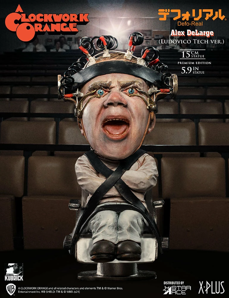This statue features Alex undergoing the torturous βLudovico Techniqueβ to cure him of his violent tendencies. In this highly detailed sculpture, Alex is strapped to a chair with his eyelids pinned back, screaming in agony as his beautiful Ludwig Van plays while heβs forced to watch scenes of ultra-violence.Β