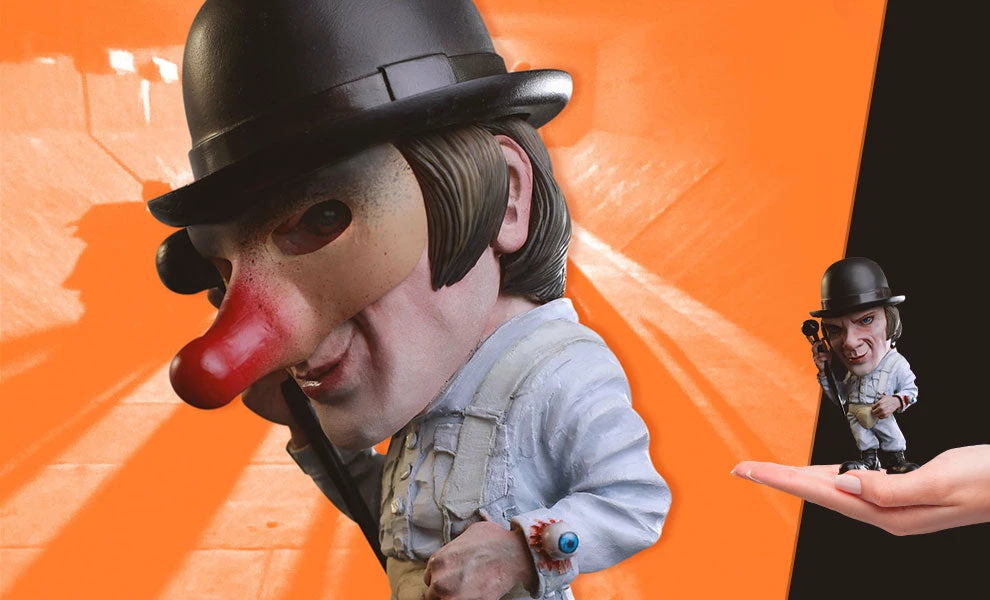 Star Ace is proud to present the first Defo Real figure from the Stanley Kubrick classic film,Β A Clockwork Orange. Alex DeLarge, as portrayed by Malcolm McDowell, was a juvenile delinquent prone to βulta-violenceβ and anti-social behavior. This Defo Real features the realistic head of Alex on a stylized body dressed in his classic white gang costume and his bowler hat, and carrying a cane. A long-nosed mask magnetically attaches to the face.