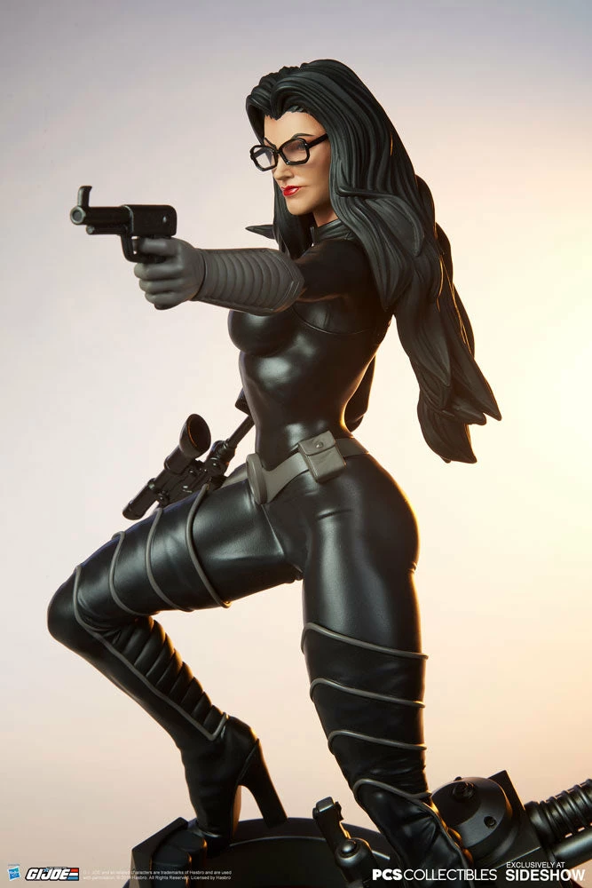 The Baroness features an entirely sculpted costume inspired by her classic animated appearance.Β Her sleek black catsuit, boots, and grey gloves have dynamic textures that mimic the movement of real fabric, along with grey piping accents for detail.Β Her determined portrait includes her famous black-rimmed glasses, while red lipstick and the Cobra logo on her chest add a pop of color to her dark look.Β The Baroness is armed with a pistol and rifle, making this femme fatale a dangerous beauty to behold.