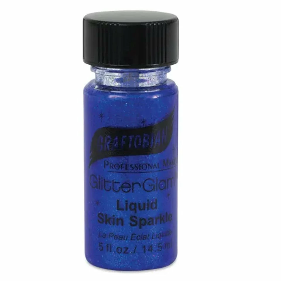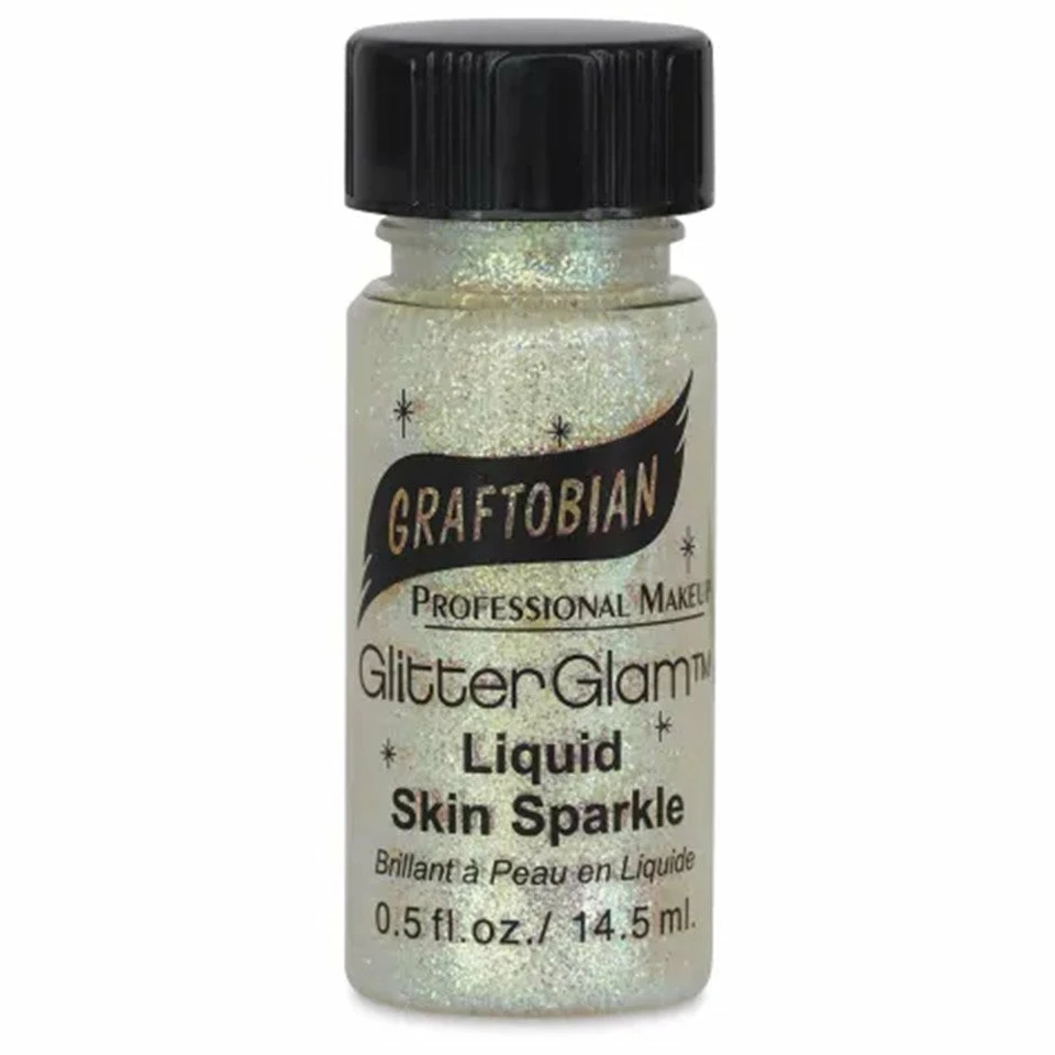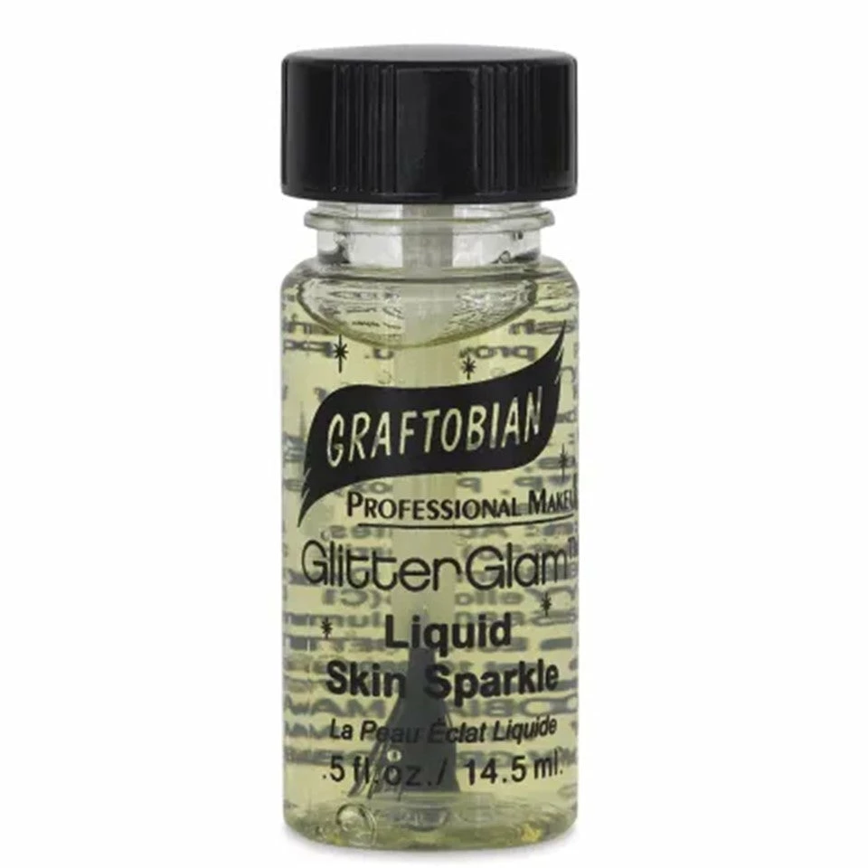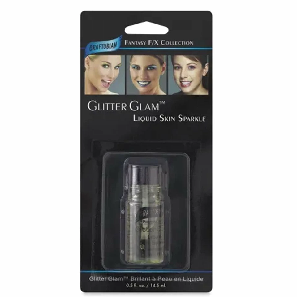 For intense sparkle that lasts, use Graftobian GlitterGlam Liquid Skin Sparkle. It’s great on lips, above eyes, and on any other skin area. Because it’s alcohol-free, the waterbased formula is safe and easier on skin than other glitter products. Once dry, GlitterGlam body glitter is super durable and sparkly. Each color is formulated for maximum visual impact and maximum shelf life. It works beautifully over lipstick. To create custom colors, you can use the Clear Mixing Base. Just mix the transparent formula with any powdered glitter of your choosing. Graftobian GlitterGlam Liquid Skin Sparkle comes in 0.5 oz (14.5 ml) bottles. The lids have built-in brushes. Cruelty-free. No animal testing. Made in the USA.