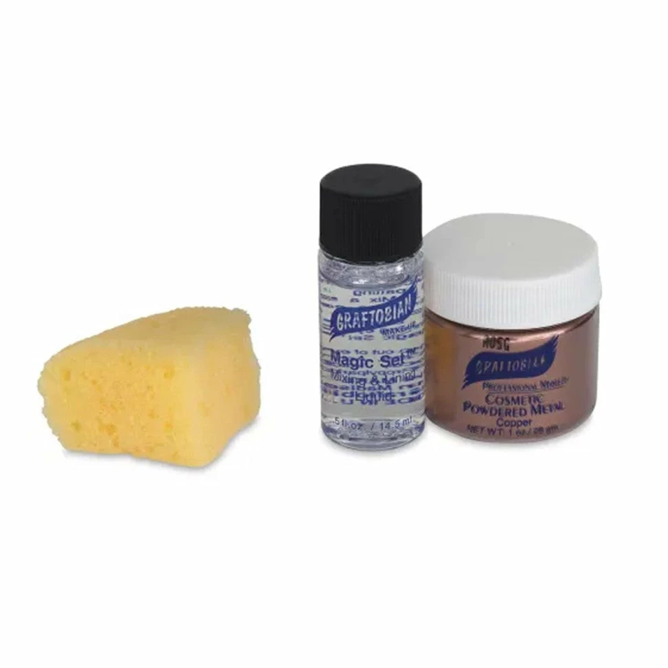 Create dramatic metallic effects with Graftobian Metal Mania Cosmetic Powdered Metal Kits. This popular metallic makeup is safe, easy to apply, and yields stunning results. Kits include a jar of Cosmetic Powdered Metal, a 0.5 oz bottle of Magic Set Mixing and Lining Liquid, and an applicator sponge. Mix the ultra-fine cosmetic powder with the Magic Set liquid, then paint or sponge the formula onto skin. Once dry, the metallic makeup is totally opaque and durableΒ βΒ it won’t rub off. Wash it from skin with soap and water. Made in the USA. NoteΒ Β βΒ May stain some fabrics. Test on an inconspicuous area before use.