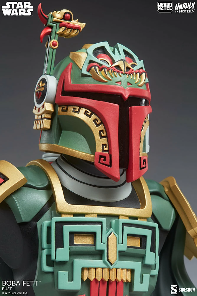 No disintegrations, all dynamite. Urban Aztec infiltrates a galaxy far, far away with the Boba Fett™ Bust by artist Jesse Hernandez, blending Mayan and Mandalorian influences into badass bounty hunter.