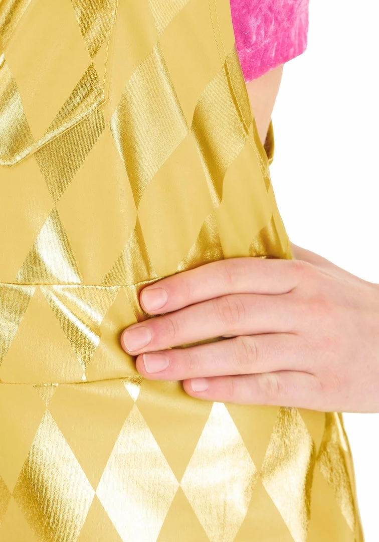 This officially licensed costume comes from the Birds of Prey movie! The simple outfit comes with a tank top and a pair of overalls designed to recreate her iconic outfit. The tank top is made out of a soft, pink velour material that stretches to fit. The gold overalls have adjustable straps and gold diamond patterns on the legs. The zipper in front adds another way to customize your look! Zipped all the way up and you have an all-business kind of Harley Quinn costume. Wear it a little bit down, and you have a Harley Quinn costume that’s ready to party!