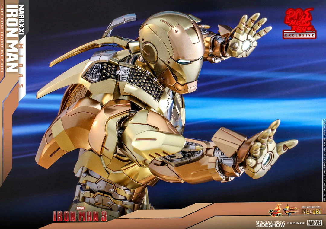 Pays great homage to one of Iron Manβs very first costumes, Hot Toys is delighted to unveil today theΒ Iron Man Mark XXI (Midas) Sixth Scale Collectible FigureΒ fromΒ Iron Man 3Β as a Hot Toys Exclusive item. Painted in different shades of metallic gold and silver, the overall appearance of the highly-detailed figure has elevated with additional chrome painting to bring out the finer armor details.