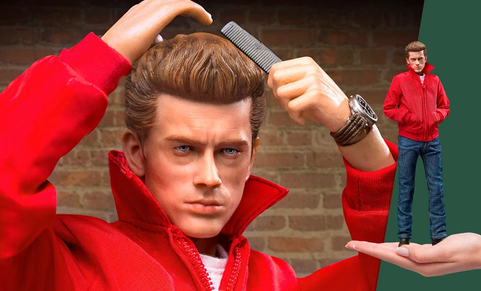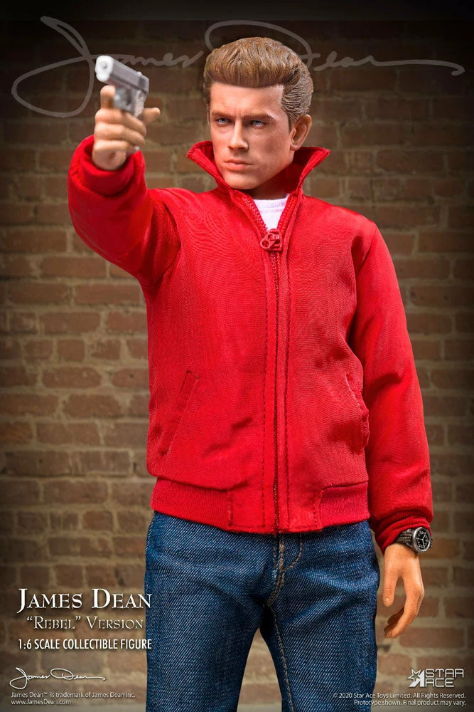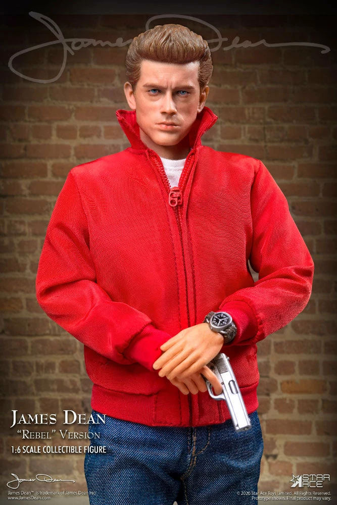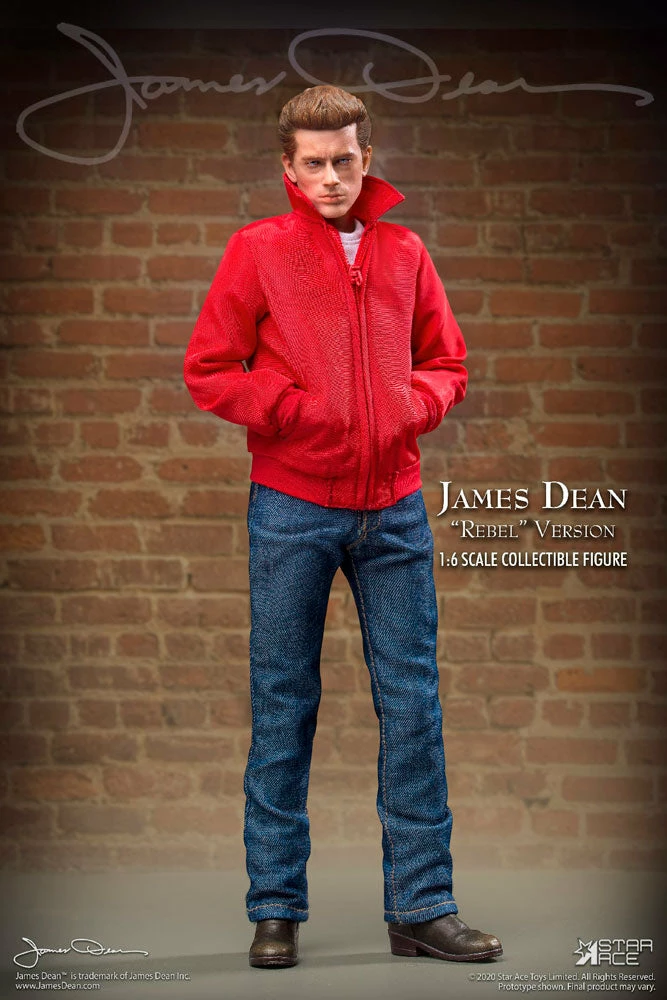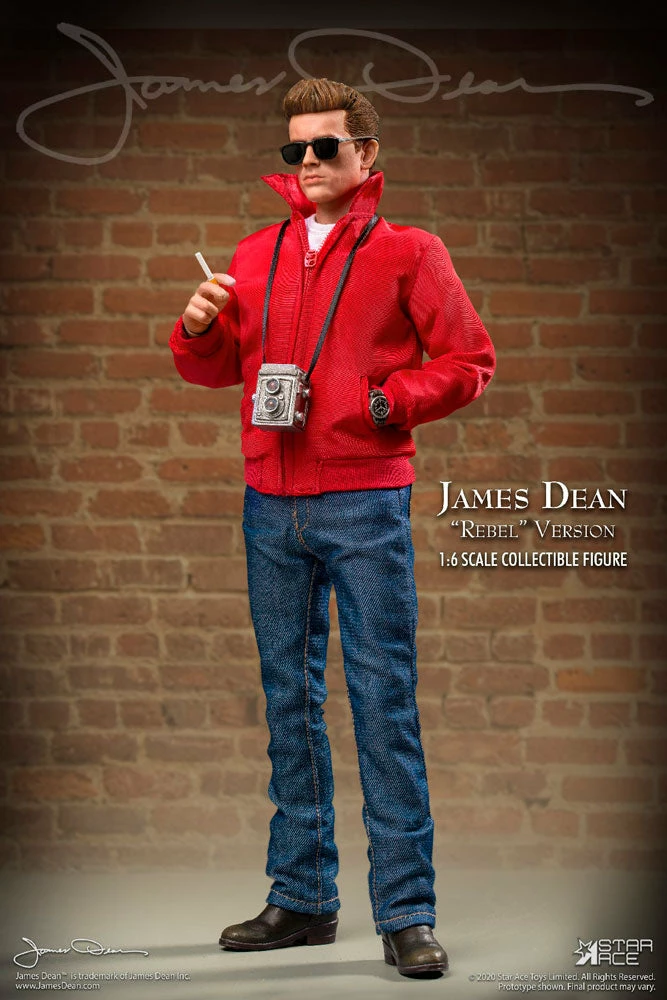Star Ace brings James Dean to life as a fully realized sixth scale figure dressed as a teen βRebelβ andΒ featuring a detailed and accurate likeness and dressed in his iconic red jacket, white T-shirt, black boots and jeans. Accessories include sunglasses, a comb, cigarettes and a camera.