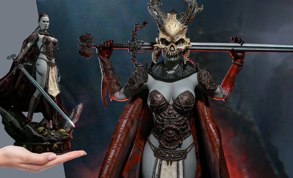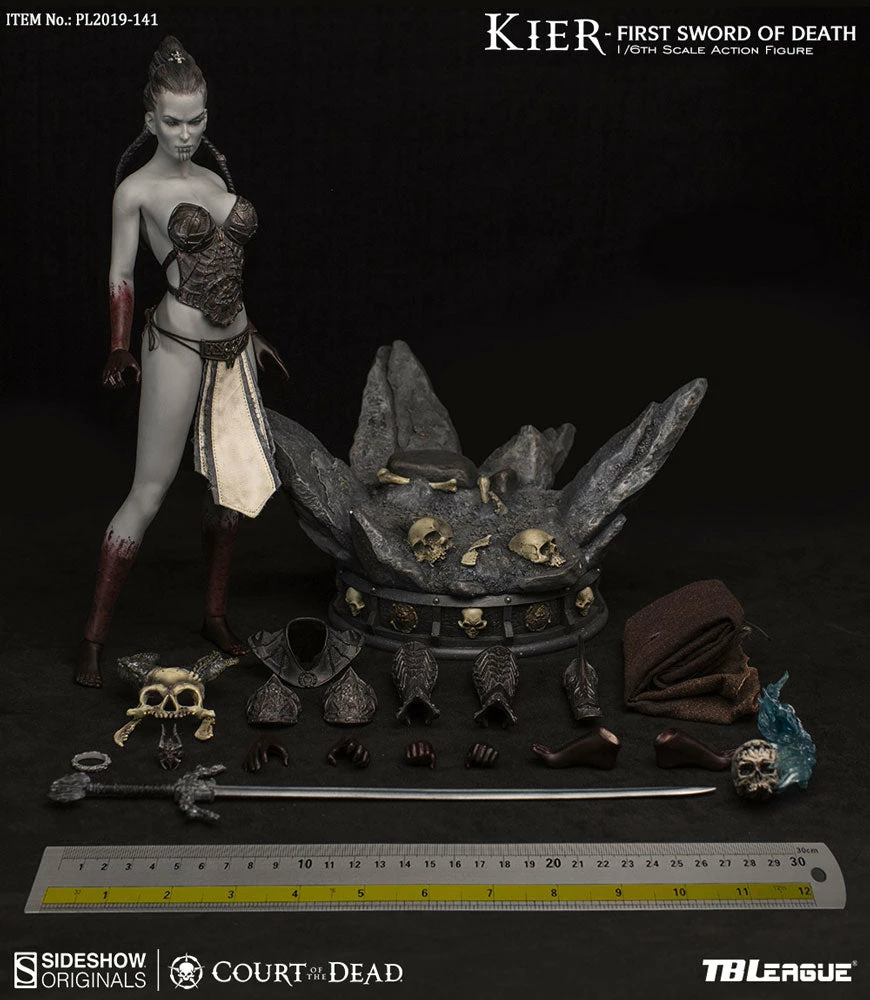 TheΒ Kier: First Sword of Death Sixth Scale FigureΒ has three pairs of interchangeable hands for gripping different items in her elaborate arsenal; one pair of open hands, one pair of hands for holding her angelic longsword, and one pair with curled fingers for grasping a skull with fresh etherea wafting off of it. She has two pairs of feet, allowing for a variety of powerful action poses. Kier also includes a battlefield base, with broken and battered terrain littered with skulls.