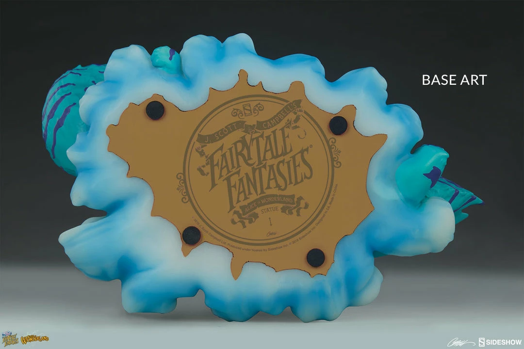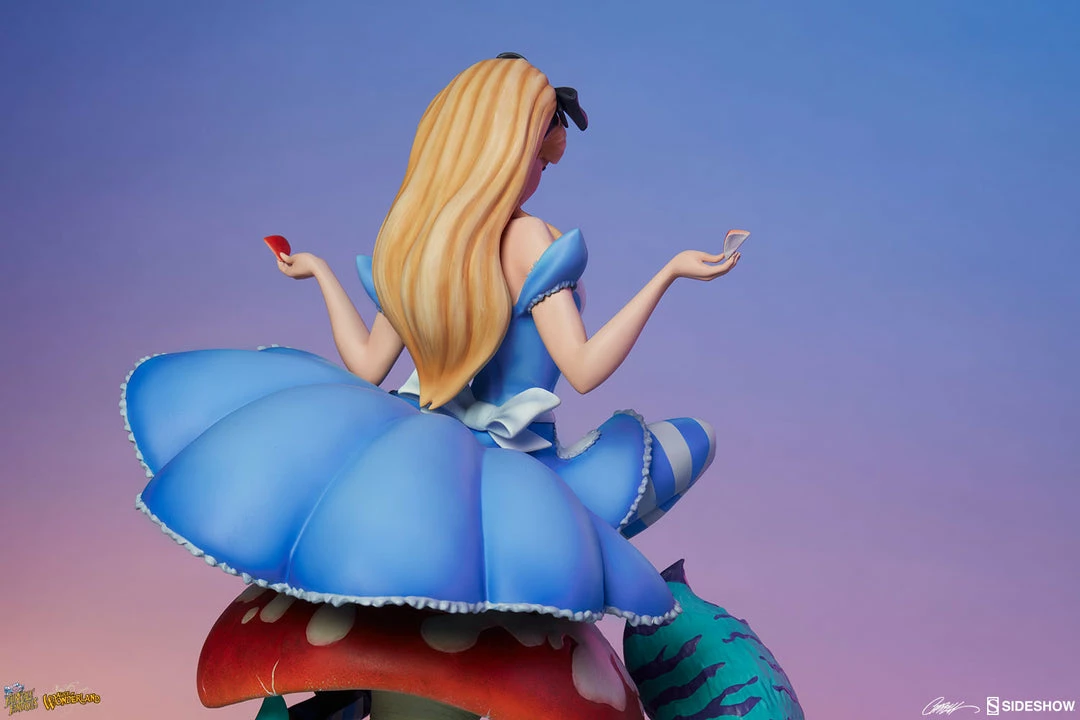 The Alice in Wonderland Statue measures 13.5β tall, as Alice sits atop a red dappled mushroom in the midst of the magical world of Wonderland, holding two segments of the size-changing toadstool in either hand. From the base of the figure, the blue and purple Cheshire Cat gives its famous toothy grin as it cleverly blends into the whimsical environment.