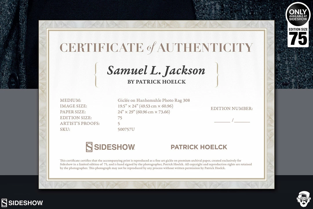 Each hand-numbered Samuel L. Jackson Fine Art Print is hand-signed by the photographer and features an embossed Seal of Authenticity as a part of the limited edition of 75 pieces. This stunning fine art portrait also includes a Certificate of Authenticity and is a must-have for fans of Jackson’s film legacy.