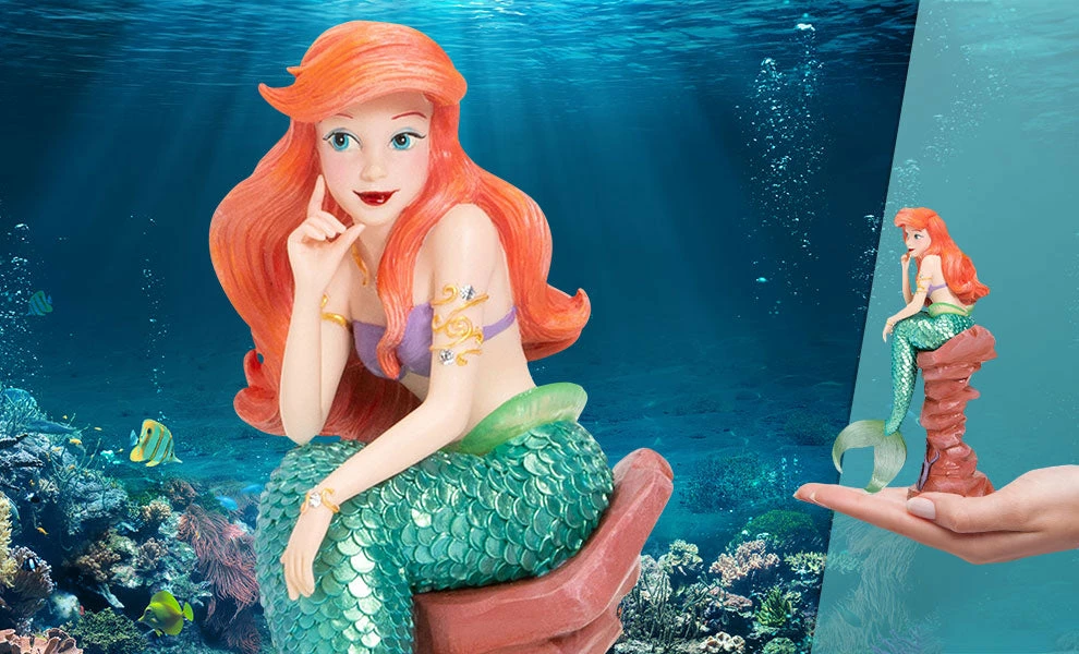 The most iconic mermaid in the world, free-spirited and curious Ariel from Disneyβs The Little Mermaid poses on an undersea rock formation evoking a stylish contemporary glamour in this sophisticated figurine from Disney Couture de Force. The modern haute couture costuming features duo-chrome color shift blue green scales on Arielβs tail, four faceted faux diamonds on her golden arm bracelets and pendant and an iridescent sea foam green finish on her fin. Other exquisite details include translucent tinted green elements around her waist and textured red hair sculpted so as to appear floating underwater. Princess Arielβs timeless and magical story from the undersea to the human world empowers us to seek our dreams and dare to be adventurous in our everyday lives.