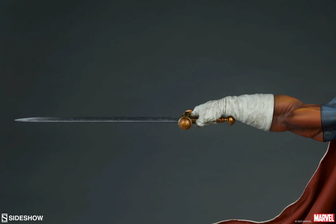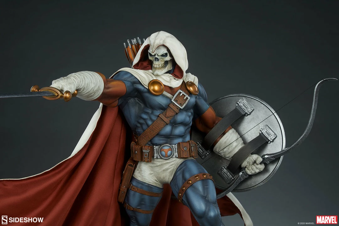 The Taskmaster Premium Format™ Figure measures 21.5” tall and 25” wide, poised on top of a training facility base as the skilled tactician Tony Masters brandishes his sword assertively at his foes. Armed with his traditional Avengers-fighting arsenal, including the sword, a shield, and a bow and quiver, Taskmaster stands confident that he has already won the battle before it even begins.